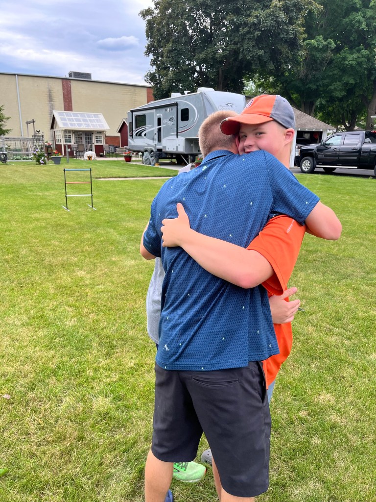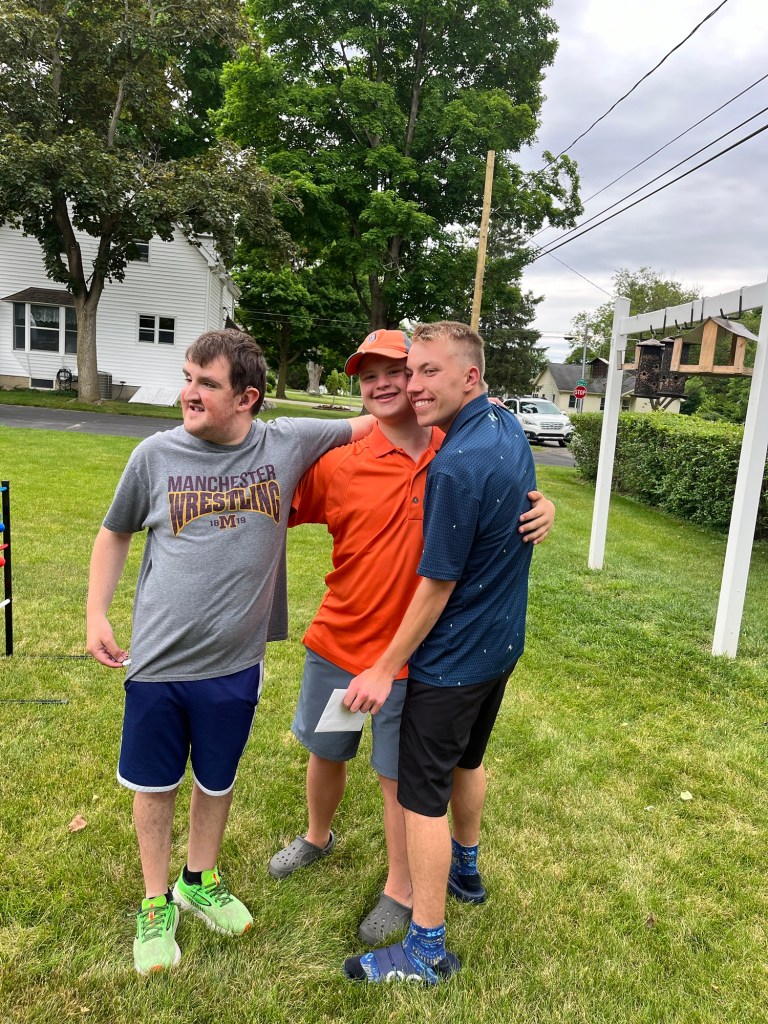 Wil recently went to his friend, Will D.’s, graduation party. Will D. also has a disability but has a much higher athletic ability than Wil T. Will D. has run ½ marathons and was on the track, cross-country, and baseball teams. As such, many typically developing athletic classmates attended Will D.’s graduation party. Two of these teammates were playing cornhole out in the sideyard when we arrived. These two boys gave a hearty hello to Wil T. and invited him to play cornhole with them. All the players found an equilibrium; their conversations were well-matched, relaxed, and fun. Watching this filled my heart.